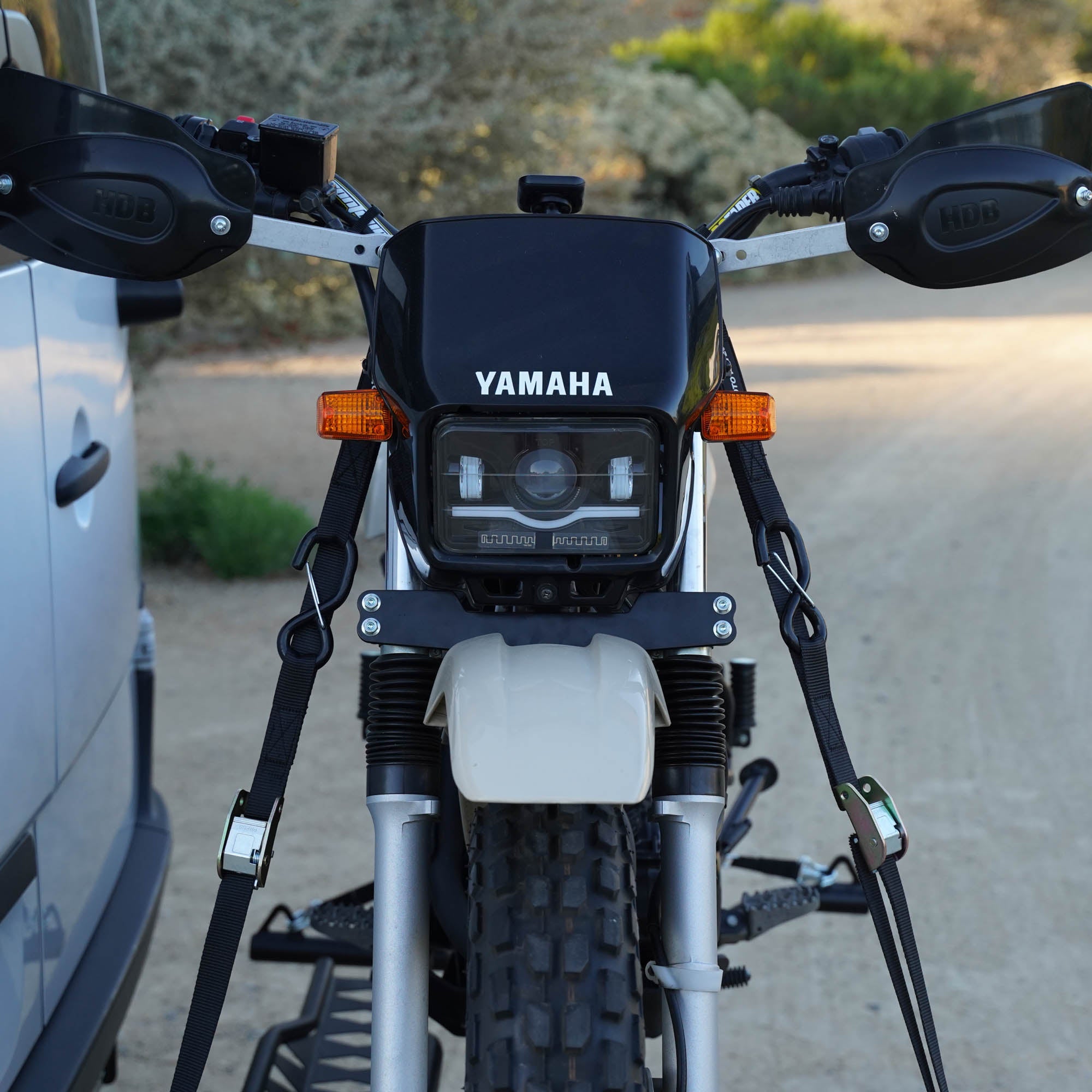 Locking, soft-loop motorcycle tie-downs with a spring loaded lever designed for motorcycle carriers with a 720 lb. working load limit.